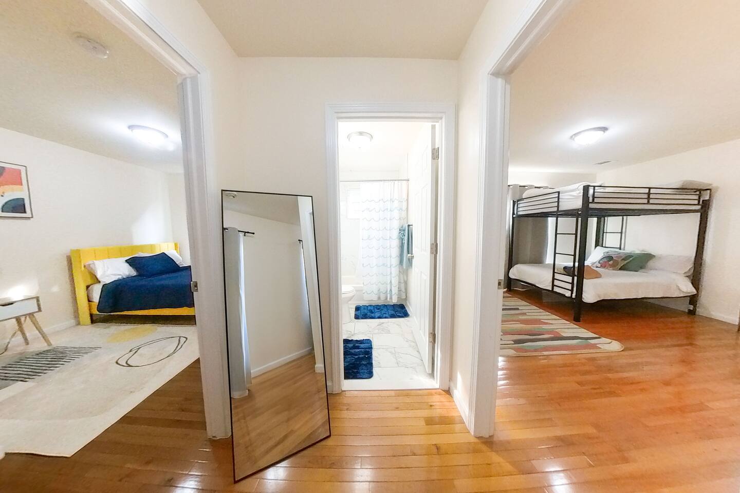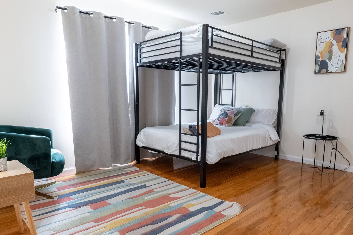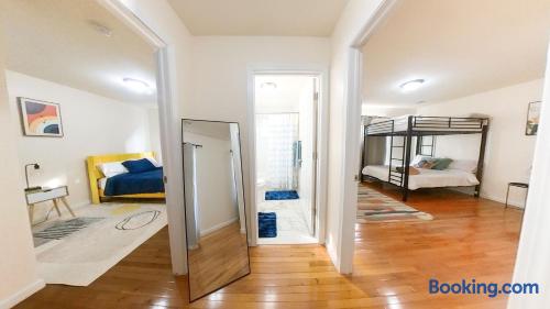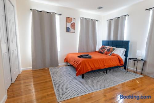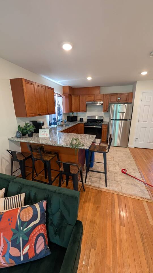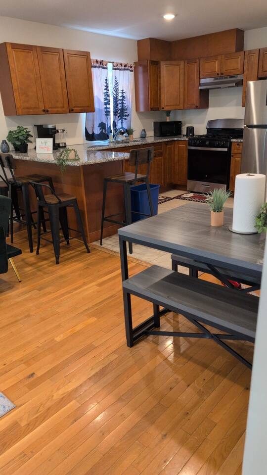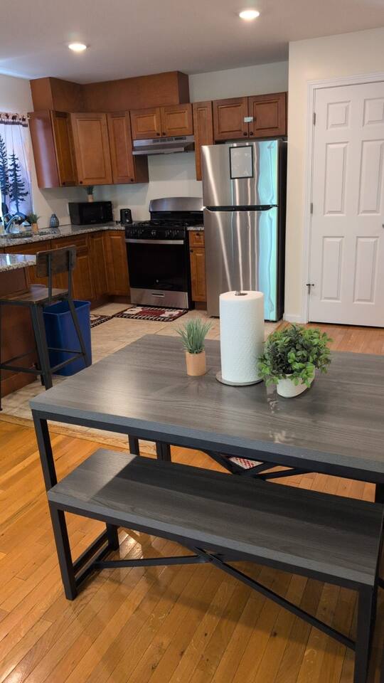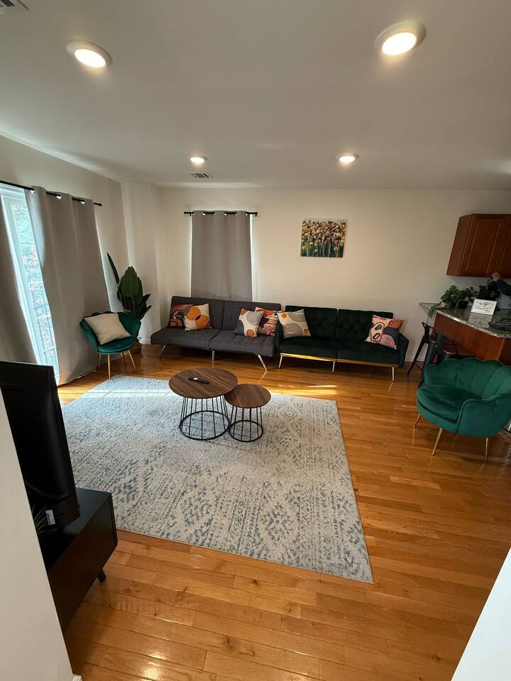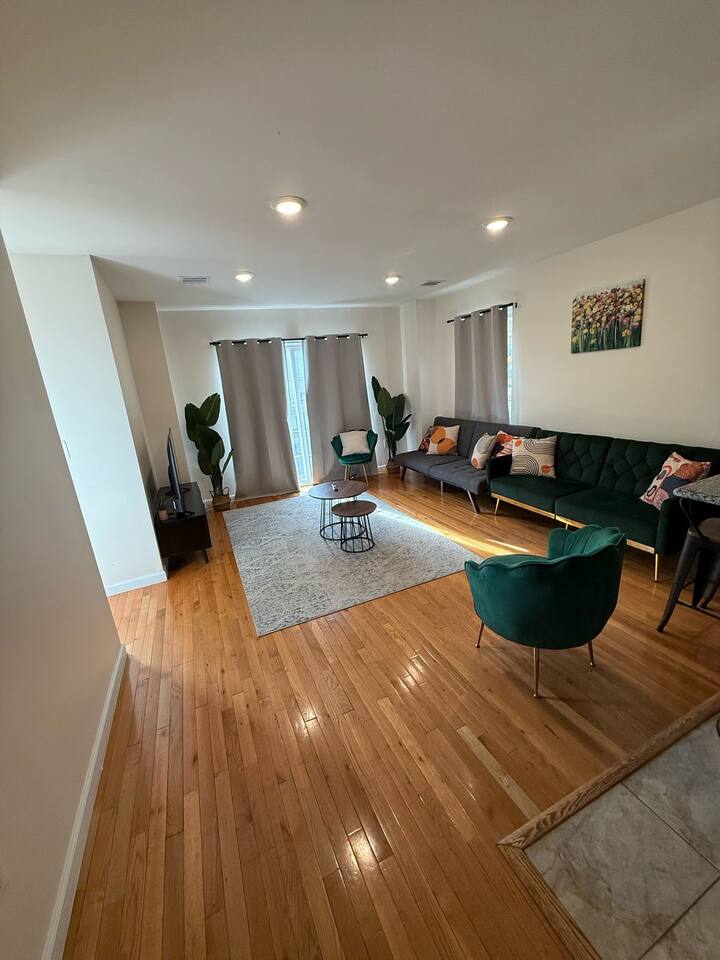 We invite you to immerse yourself in the elegance and tranquility of our spacious 3-bedroom apartment no 3 for as many nights as you wish! Relax in the warm and welcoming ambiance of our thoughtfully designed space. Perfectly situated in a prime location, this apartment offers unbeatable convenience for commuters! Famous Attractions: 1. New York City: 30 Min (12.1 Miles) 2. Manhattan: 37 Min (15.2 Miles) 3. Downtown Newark: 11 Min (2.1 Miles) 4. Park Ave Station: 1 Min (0.3 Mile) 5. Cathedral Basilica Of The Sacred Heart: 4 Min (1.2 Miles) 6. Broadway: 10 Min (2.8 Miles) 7. The Jewish Museum Of New Jersey: 6 Min (1.2 Miles) 8. Park Avenue Newark: 6 Min (1.5 Miles) 9. The Newark Museum Of Art: 8 Min (1.7 Miles) 10. Dreyfuss Planetarium: 8 Min (1.7 Miles) 11. Newark Public Library: 8 Min (1.8 Miles) 12. The New Jersey Performing Arts Center: 9 Min (1.8 Miles) 13. New Jersey Historical Society: 10 Min (2.1 Miles) 14. Lincoln Park: 13 Min (2.7 Miles) 15. Journal Square: 19 Min (8.0 Miles) 16. Statue Of Liberty: 26 Min (15.6 Miles) 17. National 9/11 Memorial And Museum: 32 Min (12.0 Miles) 18. Times Square: 32 Min (14.1 Miles) 19. Empire State Building: 33 Min (14.0 Miles) 20. Top Of The Rock: 35 Min (14.9 Miles) 21. The Metropolitan Museum Of Art: 45 Min (16.6 Miles) 22. Newark Penn Station: 13 min (2.4 miles) 23. Branch Brook Park: 2 min (0.7 mile) 24. Military Park: 9 min (1.8 miles) 25. Presidential Park: 12 min (2.3 miles) 26. Ironbound: 17 min (3.8 miles) 27. The High Line: 25 min (13.9 miles) 28. Central Park: 34 min (14.7 miles) 29. Teardrop Park: 29 min (11.6 miles) 30. Tear Drop Memorial: 26 min (15.0 miles) 31. Vessel: 25 min (13.8 miles) 32. Red Bull Arena: 13 min (3.4 miles) 33. Newark Liberty International Airport: 15 min (11.8 miles) 34. NJIT: 5 min (1.2 miles) Restaurants: 1. La Parada Dominicana/Santo Domingo Stop Restaurant: 2 Min (0.4 Mile) 2. Tony's Hot Dogs: 2 Min (0.6 Mile) 3. Dania's Restaurant: 3 Min (0.6 Mile) 4. La Esperanza Restaurant: 4 Min (0.7 Mile) 5. Coney Island Restaurant: 4 Min (0.8 Mile) 6. Calandra's Bakery: 5 Min (1.0 Mile) 7. El Paisa Happy Chicken: 5 Min (1.0 Mile) 8. Bloomfield Avenue BBQ: 5 Min (1.1 Miles) 9. Manny Restaurant: 6 Min (1.0 Mile) 10. TeaRx Cafe-Newark(R): 6 Min (1.3 Miles) 11. The Plaza Diner: 9 Min (2.3 Miles) 12. Aroma & Sabor Restaurant: 11 Min (0.5 Mile) Malls: 1. Brick Church Plaza: 7 Min (2.4 Miles) 2. Franklin Square Plaza: 10 Min (2.8 Miles) 3. Essex Green Shopping Center: 9 Min (6.3 Miles) 4. The Mall At Short Hills: 21 Min (13.2 Miles) 5. The Mills At Jersey Gardens: 21 Min (13.2 Miles) 6. Westfield Garden State Plaza: 20 Min (16.9 Miles) 7. Menlo Park Mall: 24 Min (18.7 Miles) 8. Brunswick Square: 41 Min (32.5 Miles) 9. Costco Wholesale: 18 Minutes (8.3 Miles) 10. Lidl: 14 Minutes (4.5 Miles) 11. Home Depot: 11 Minutes (2.9 Miles) Bars And Nightclubs: 1. La Roca Night Club: 2 Min (0.4 Mile) 2. Lucky 7: 2 Min (0.6 Mile) 3. Bar Envy: 5 Min (0.9 Mile) 4. Misuero Karaoke Latino The Show: 7 Min (1.2 Miles) Medical Centers And Hospitals: 1. Urgent Care & Walk-In Medical Suite: 6 Min (2.1 Miles) 2. Rutgers Health: 8 Min (1.2 Miles) 3. CareWell Health Medical Center: 8 Min (2.5 Miles) 4. Serene Health Center: 8 Min (1.7 Miles) 5. St Michael's Medical Ctr: 9 Min (1.3 Miles) 6. Silver Lake Hospital: 9 Min (1.7 Miles) 7. University Hospital: 9 Min (1.3 Miles) 8. Newark Community Health Center: 11 Min (2.8 Miles) NO PARTIES, CELEBRATIONS OR GATHERINGS IN THE APT Our Apartment is perfect for: Travel Nurses Students & Faculty Business Professionals Leisure Travels Sports & Concert Lovers Travelers and Explorers Tourists Small Families Whether your journey is for business or pleasure, our place promises to be your sanctuary, facilitating relaxation and rejuvenation. Upon entering, you'll immediately sense a positive energy that uplifts your spirits and creates a welcoming atmosphere. Every corner of this stylish 3-bedroom apt exudes elegance, from its carefully curated design to its thoughtful decor, catering perfectly to both short and long-term stays. Enjoy elegant floors adorned with area rugs, enhancing maneuverability and ensuring your comfort is paramount. The bedrooms provide a serene retreat, ideal for unwinding after a busy day, ensuring a restful night's sleep. LIVING AREA - Gather around in this area to watch your favorite TV shows, and unwind! Comfortable SOFA BED that can sleep two as well. Smart TV Elegant nesting tables Large stylish rug KITCHEN & DINING Our kitchen has all the essentials mentioned in amenities right at your fingertips! Plus, 2 bar stools are perfectly placed next to the kitchen counter for easy and enjoyable meals. Microwave Stove/Oven Refrigerator/Freezer Sink (Hot/Cold Water) Glasses & Cups Silverware Plates Pots & Pans SLEEPING ARRANGEMENTS - 10 1 BEDROOM - Queen bed for 2, 2nd BEROOM - Pull out bed for 2 with Shared bathroom. 3rd Master BEDROOM with Queen size BUNK BED for 4 & attached bathroom All bedrooms have CLOSETS. SOFA BED in living area to sleep 2 Indulge in a restful slumber in our beautifully furnished bedroom, complete with amenities designed to ensure a tranquil and serene stay. BEDROOMS Beds with Pillows, Linens, and Sheets Closet with Hangers Night Stands with lamps BATHROOM Our stunning bathrooms comes fully stocked with all the essential toiletries you'll need for a comfortable stay! Shower Vanity Mirror Toilet Towels Hair Dryer Shampoo & Conditioner Come unwind and savor the comfort of our sleek, contemporary Apt in the heart of Newark, New Jersey!